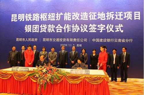 2009年11月3日,昆明市交通投资有限责任公司与中国建设银行云南省分在震庄宾馆举行“昆明铁路枢纽扩能改造征地拆迁项目银团贷款合作协议签字仪式”。昆明市交通投资有限责任公司董事长雷升逵与中国建设银行云南省分行行长潘念宁在总额为100亿元的贷款合作协议上签字。昆明市人民政府副市长何波在签字仪式上致辞;中国建设银行副行长胡哲一、昆明市委和市政府相关领导出席并见证了签约仪式。